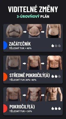 Nezáleží na tom, zda s fitness teprve začínáte, nebo jste zkušený sportovec; nabízíme tři úrovně obtížnosti, aby si každý našel to své. Tréninkové sestavy, pečlivě připravené profesionálním fitness trenérem, se zaměřují na klíčové oblasti, které trápí zejména muže, jako je břicho a hrudník, a pomáhají rychle redukovat tuk a rýsovat břišní svaly. Každodenní změna cvičení zajišťuje, že vaše motivace zůstane vysoká a trénink nikdy nezevšední. Máte zraněné koleno nebo bolavá záda? Náš program vám umožní přizpůsobit si každou sestavu, vyřadit nežádoucí cviky a upravit pořadí či délku odpočinku, aby byl trénink vždy bezpečný a efektivní právě pro vás.
